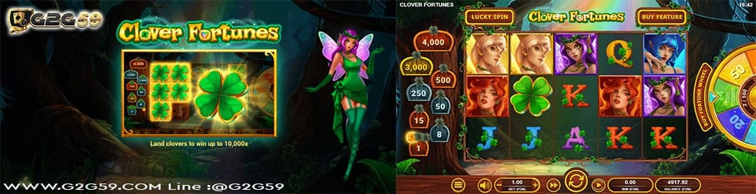 - กฎของเกม Clover Fortunes และตารางการจ่ายเงินจะพบได้ผ่านปุ่มเมนู
